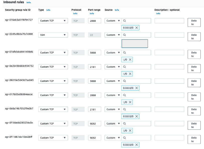 zookeeper 와 kafka cluster 가 서로 통신하기 위해서는 inbound 규칙을 생성해야 한다. 방화벽 설정은 Security Group 에서 수정할 수 있다. 생성한 kafka 인스턴스들이 속해있는 Security Group Name 을 찾아서 inbound 규칙을 추가해주면 된다.