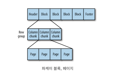 파케이 파일의 각 블록은 행 그룹을 저장한다. 행 그룹은 행에 대한 칼럼 데이터를 포함한 칼럼 청크로 되어 있다.