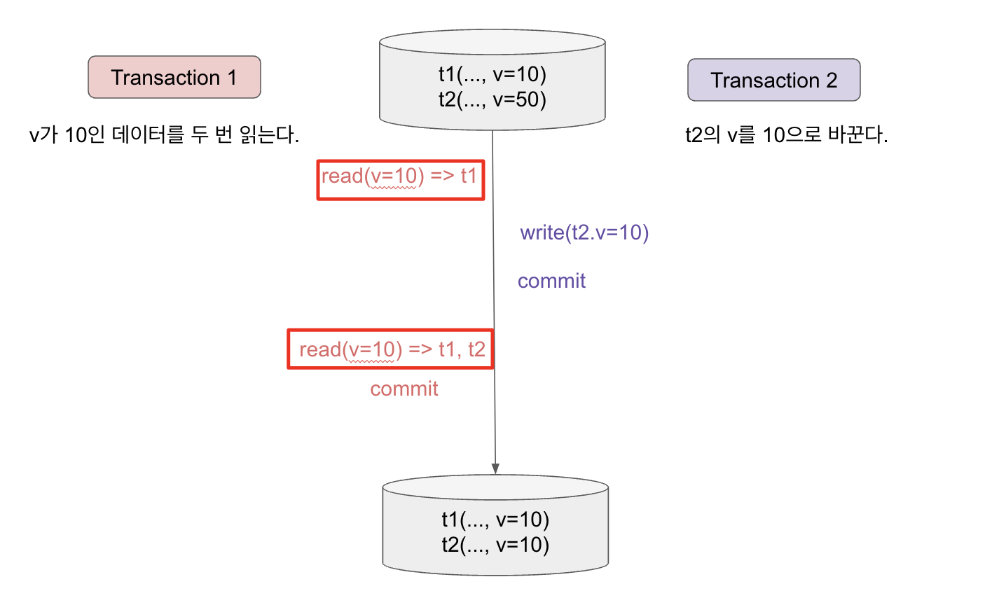 - Transaction 1에서 다시 x 를 읽으니 10 이 아니고 50이 나왔다.