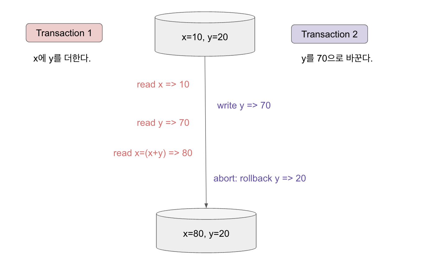 - 그런데 y를 70으로 바꾸는 Transaction 이 abort 되어서 rollback 되었다고 했을 때, x + y는 20이 되어야 정상이나 80으로 처리된다.