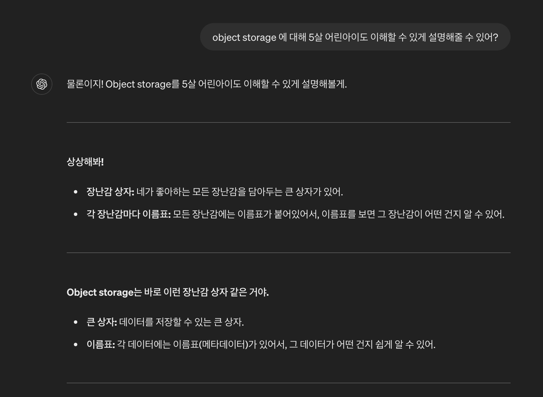 메타데이터: 각 객체에 추가적인 정보를 담을 수 있는 메타데이터를 붙일 수 있어. 이를 통해 더 정교하게 데이터를 관리할 수 있음