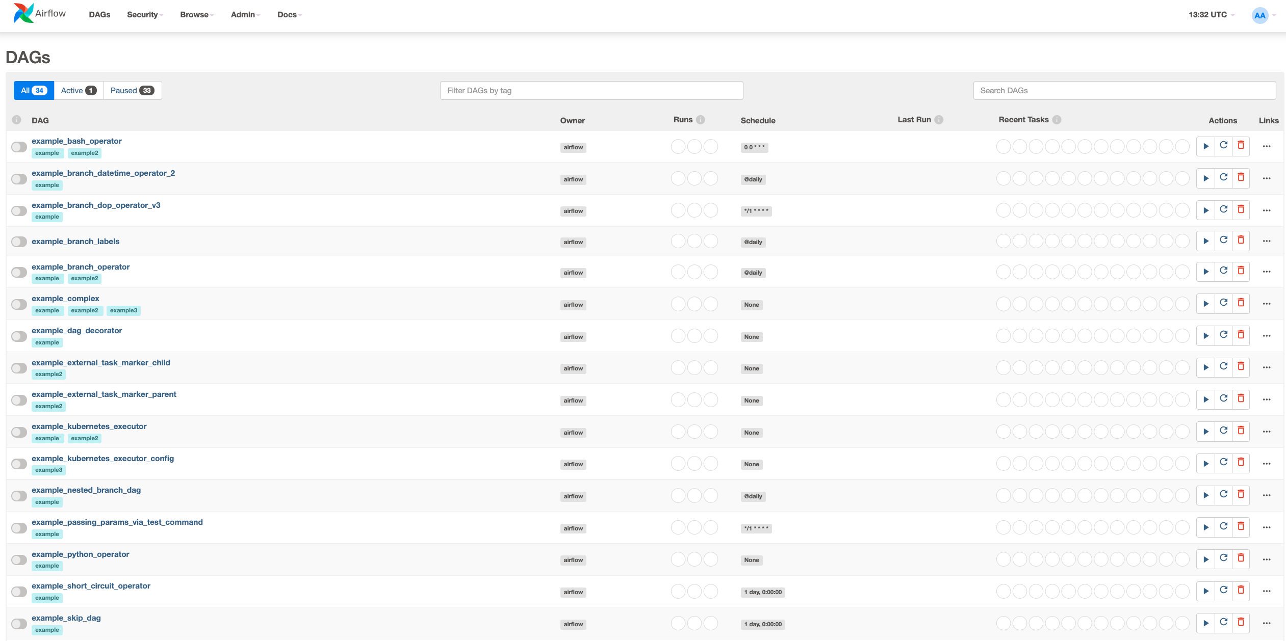Airflow๋ฅผ ์คํ์ํค๋ฉด ์ด๋ฐ ์น UI๊ฐ ๋์จ๋ค. ์ผ์ชฝ์ ๋ณด์ด๋ ๊ฒ๋ค์ด DAG ์์๋ค์ด๋ค.