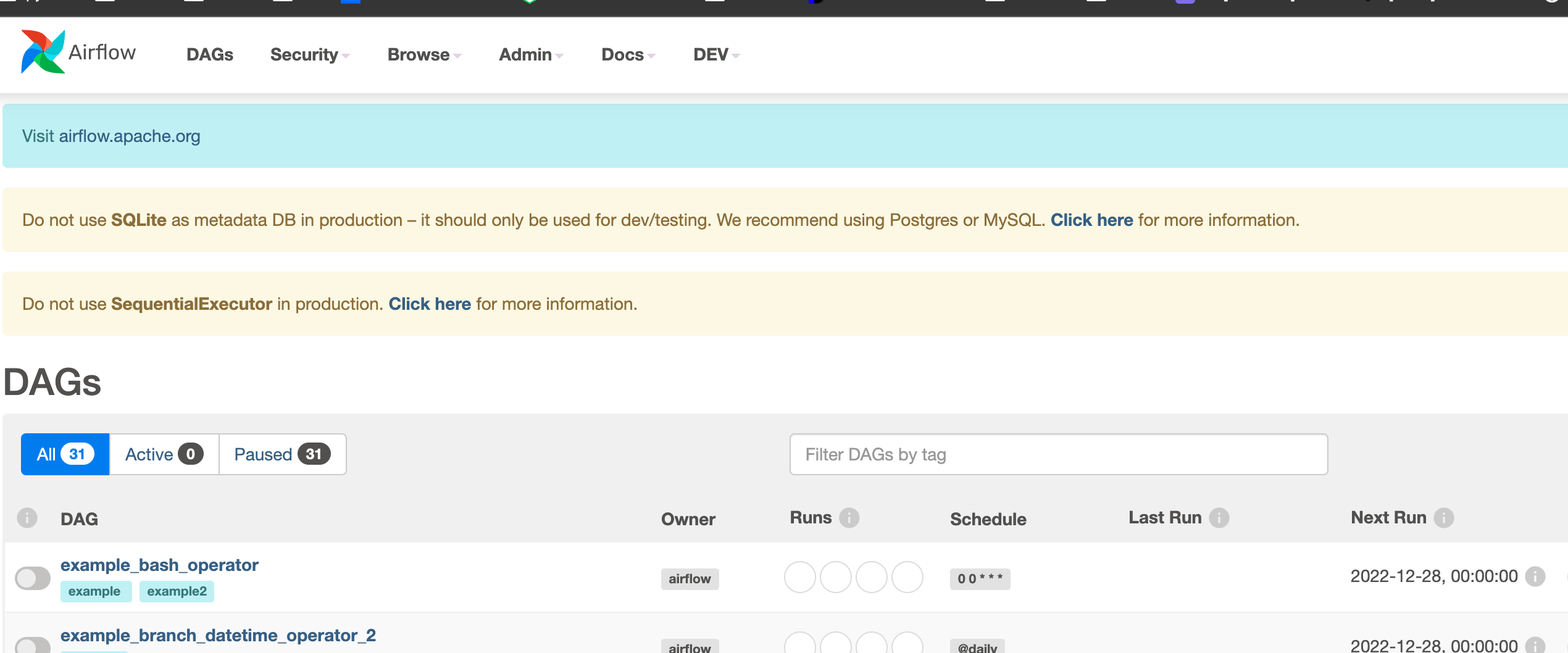 이렇게 하면 위와 같은 DEV 메뉴가 생성된 Airflow Webserver 가 띄워지게 된다.