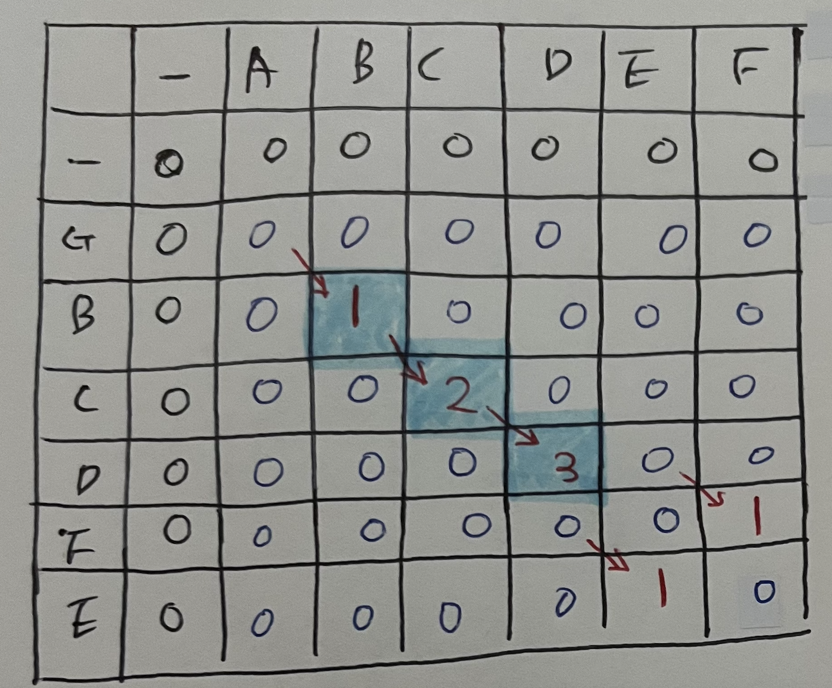 즉, ABCD와 GBCDF의 최장 공통부분수열의 값은 3이된다.