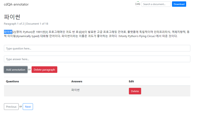 (cdQA-annotator를 이용하였다. cdQA-annotator를 띄우는 방법은 나중에 다시 작성하겠다.)