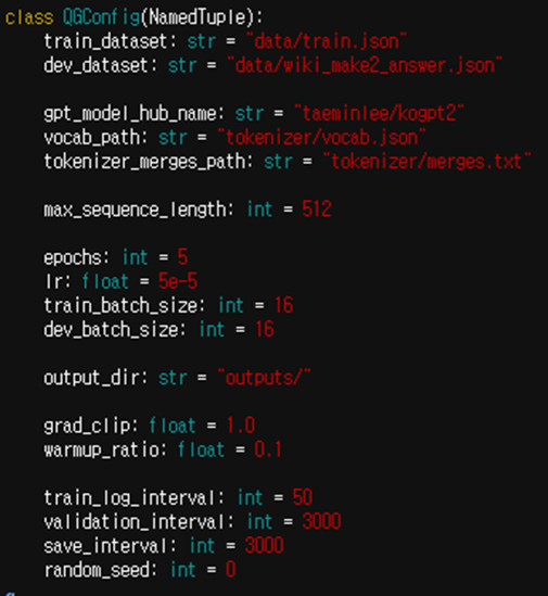 KorQuAD-Question-Generation/korquad_ag/config.py 에 들어가서 dev.json이 아닌 나의 데이터 셋으로 바꿔주었다.
