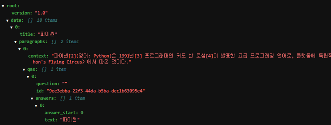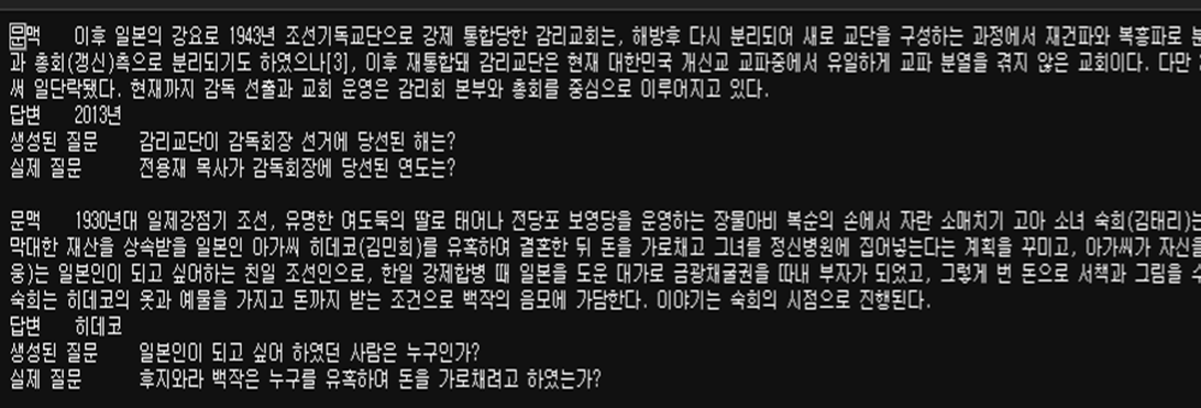 이처럼 korquad1.0 데이터 셋과 비슷하게 질문만 없이 출력된 것을 볼 수 있다.
